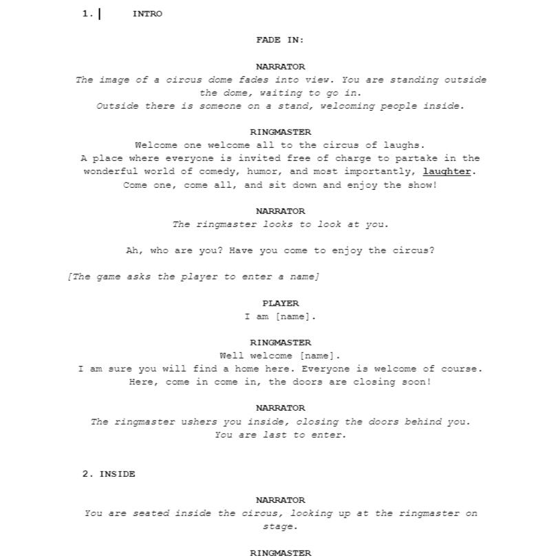 Narrative Designer, Creative Head, Voice ActorVisual Novel/Puzzle GameThe Circle of Laughs is a game about participating in short circus-themed mini-games while staying alive through the power of their own laughter. Two mini-games are played within the context of a story told through dialogue with the game's main character.This game was created as a part of the 2024 Global Game Jam, with the theme: Make Me Laugh. My team and I created the game over the span of 32 hours.Made with Unity